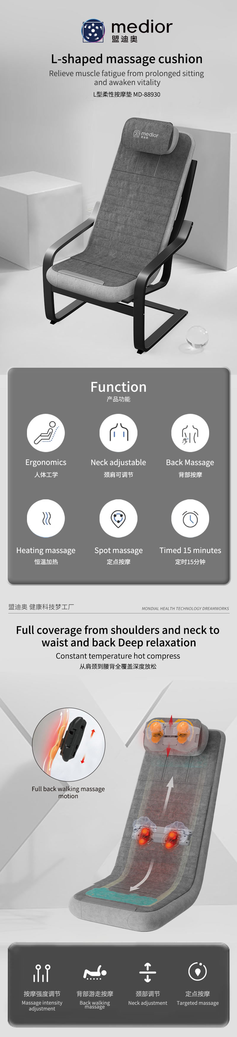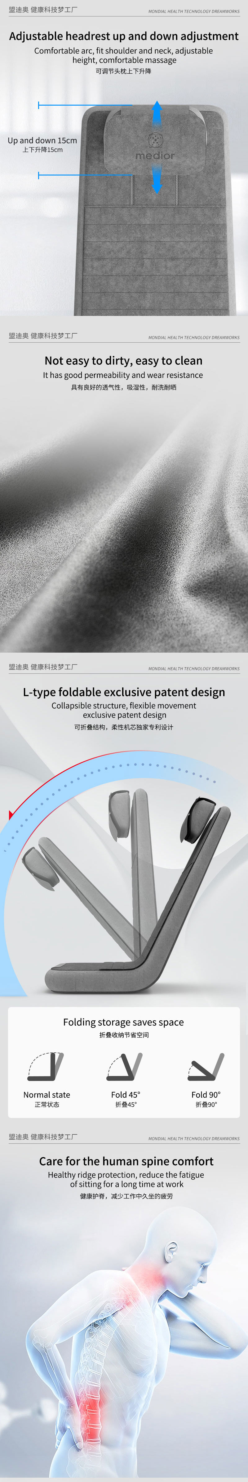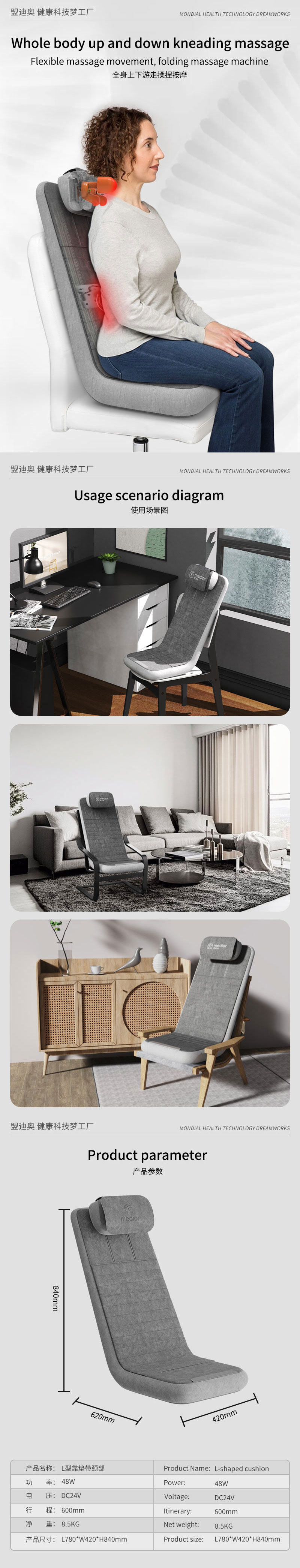 1、L型機(jī)芯結(jié)構(gòu),對折包裝縮小體積2、獨家專利柔性機(jī)芯3、力度三檔調(diào)節(jié),定點按摩,腰背按摩、臀腿按摩、全背按摩模式選擇4、背部行走揉捏,按摩區(qū)域加長到從肩膀到大腿;5、更加貼合不同款式的椅子整體可對折收納